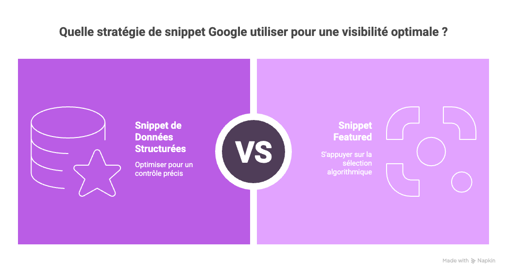 Techniquement, l’un s’obtient via des données structurées spécifiques. L’autre (le featured snippet) est choisi arbitrairement par l’algorithme de Google pour sa pertinence à répondre à une question précise.