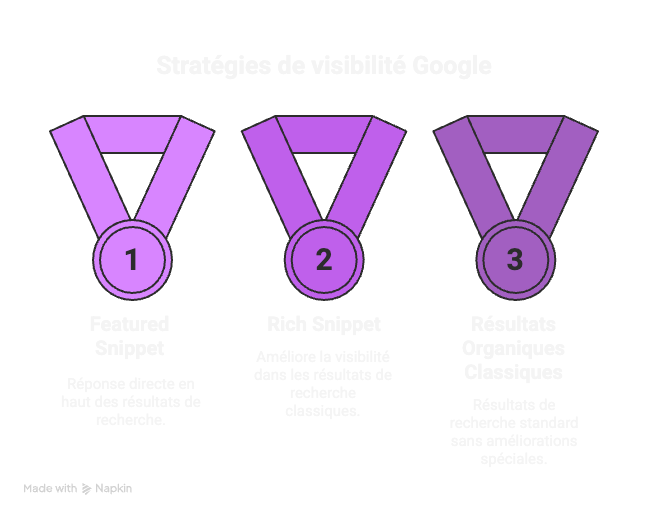 Attention à la nuance. Le rich snippet google vient simplement habiller un résultat organique classique. Le featured snippet (ou « position zéro ») est une réponse directe extraite d’une page et propulsée tout en haut des résultats.