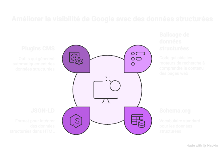 Il s’agit d’une relation de cause à effet. Les données structurées (souvent au format Schema.org / JSON-LD) sont le code invisible que vous intégrez à votre site pour « parler » aux robots de Google. C’est le moyen technique.